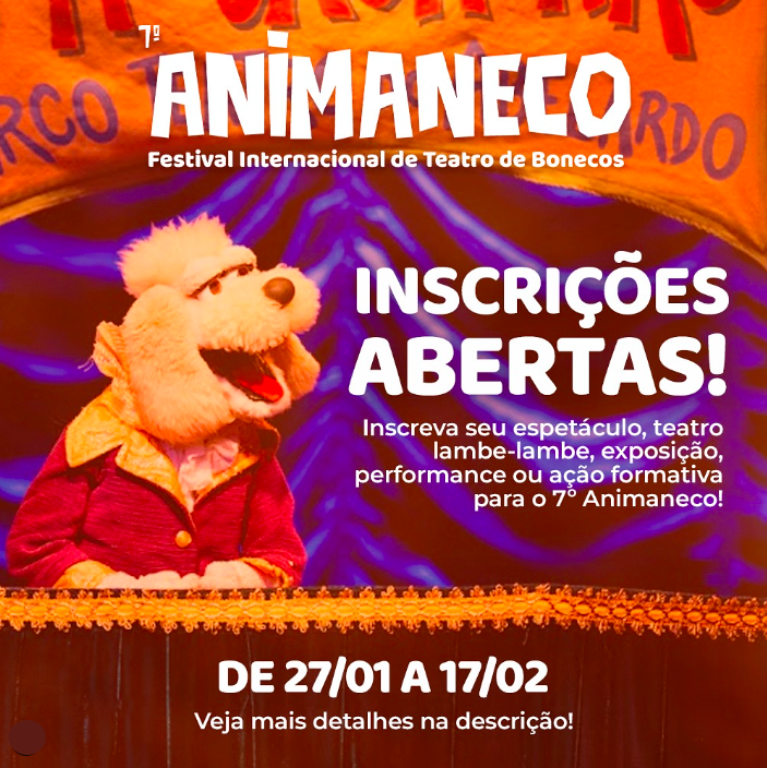 As inscrições para atores e grupos teatrais estão abertas para o 7o  Animaneco – Festival Internacional de Teatro de Bonecos, até 17 de fevereiro de 2025. Podem ser inscritos espetáculos, teatro lambe-lambe, exposições, performances e ações formativas.