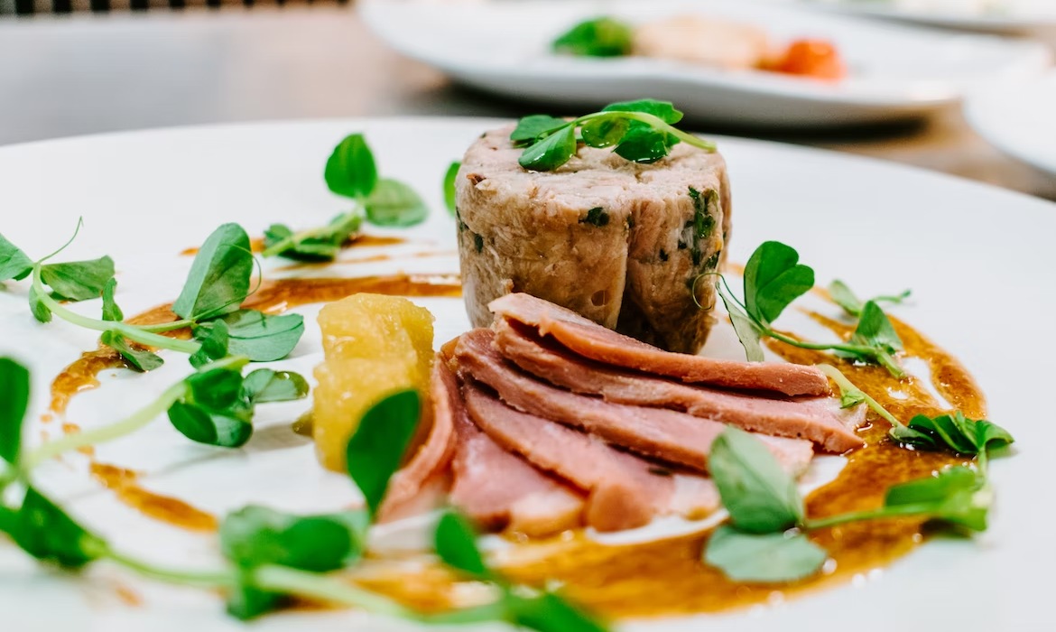 Principal: Nhoque de banana da terra na manteiga com ervas, peixe regional grelhado com tomatinhos, ervas, leite de coco e pimenta rosa (aroeira)
