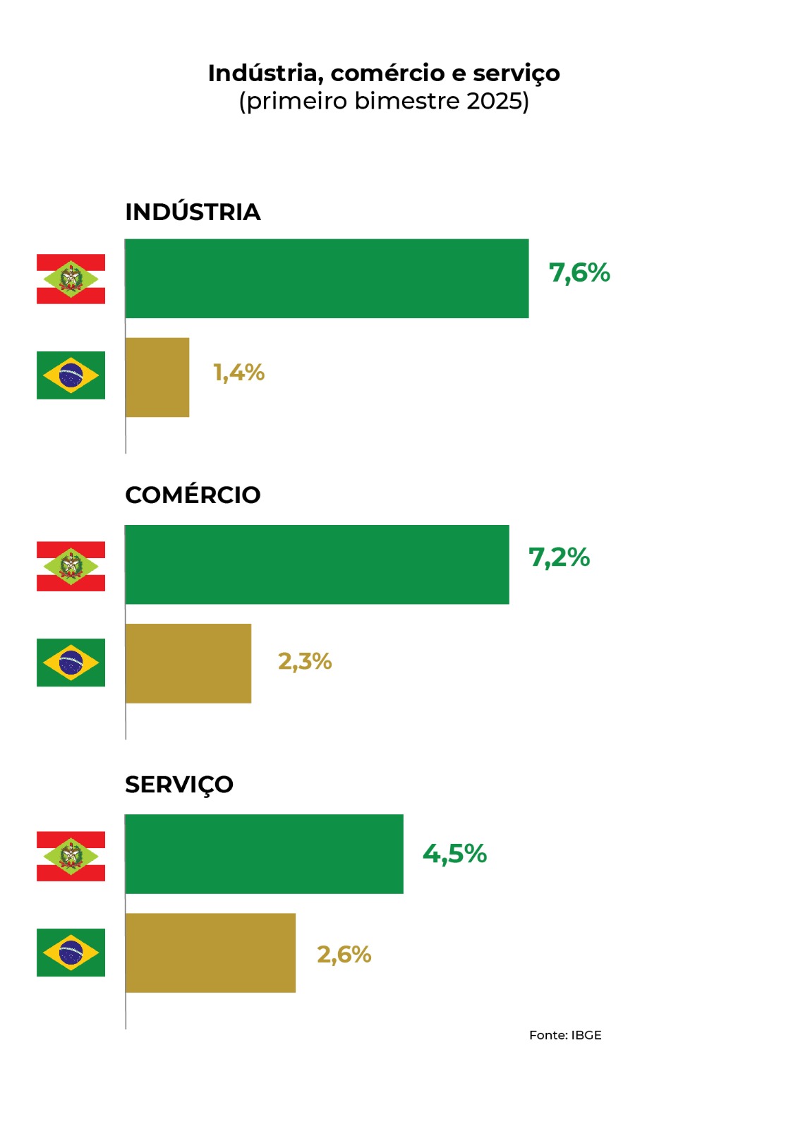 O setor de serviços de Santa Catarina também cresceu acima da média brasileira. Enquanto no país a alta foi de 2,6% em janeiro e fevereiro, no estado a elevação foi superior, de 4,5%. Os destaques do período em Santa Catarina foram os serviços prestados às famílias (12,2%) bem como os transportes (7,8%), conforme pesquisa do IBGE.