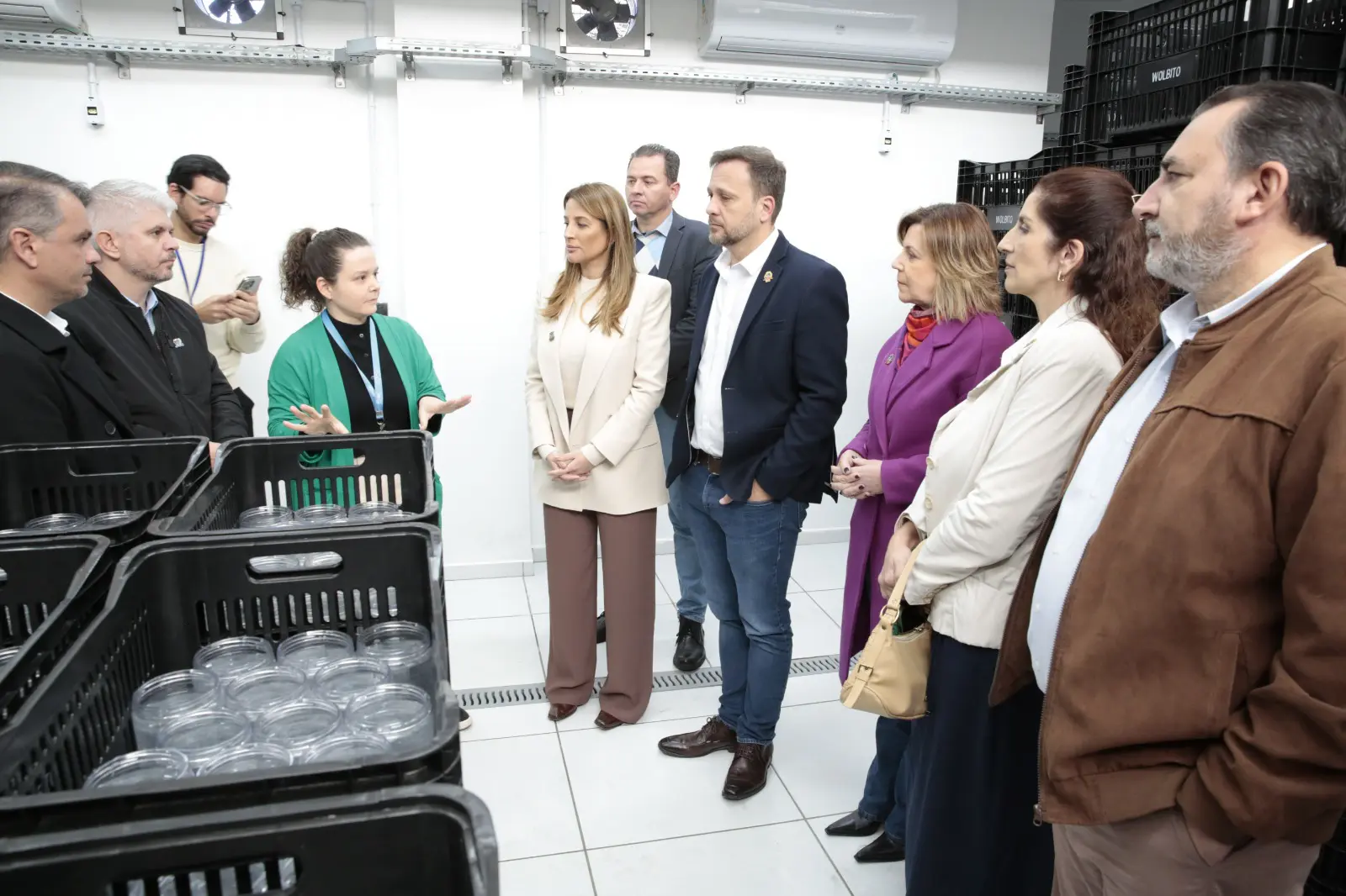 O prefeito de Joinville Adriano Silva, a vice-prefeita Rejane Gambin e a equipe técnica da Secretaria da Saúde receberam, nesta quinta-feira, 31, a prefeita de Balneário Camboriú, Juliana Pavan, o prefeito de Blumenau, Egidio Ferrari, vereadores e servidores das prefeituras para conhecerem o local onde os mosquitos do método Wolbachia são preparados para a soltura.