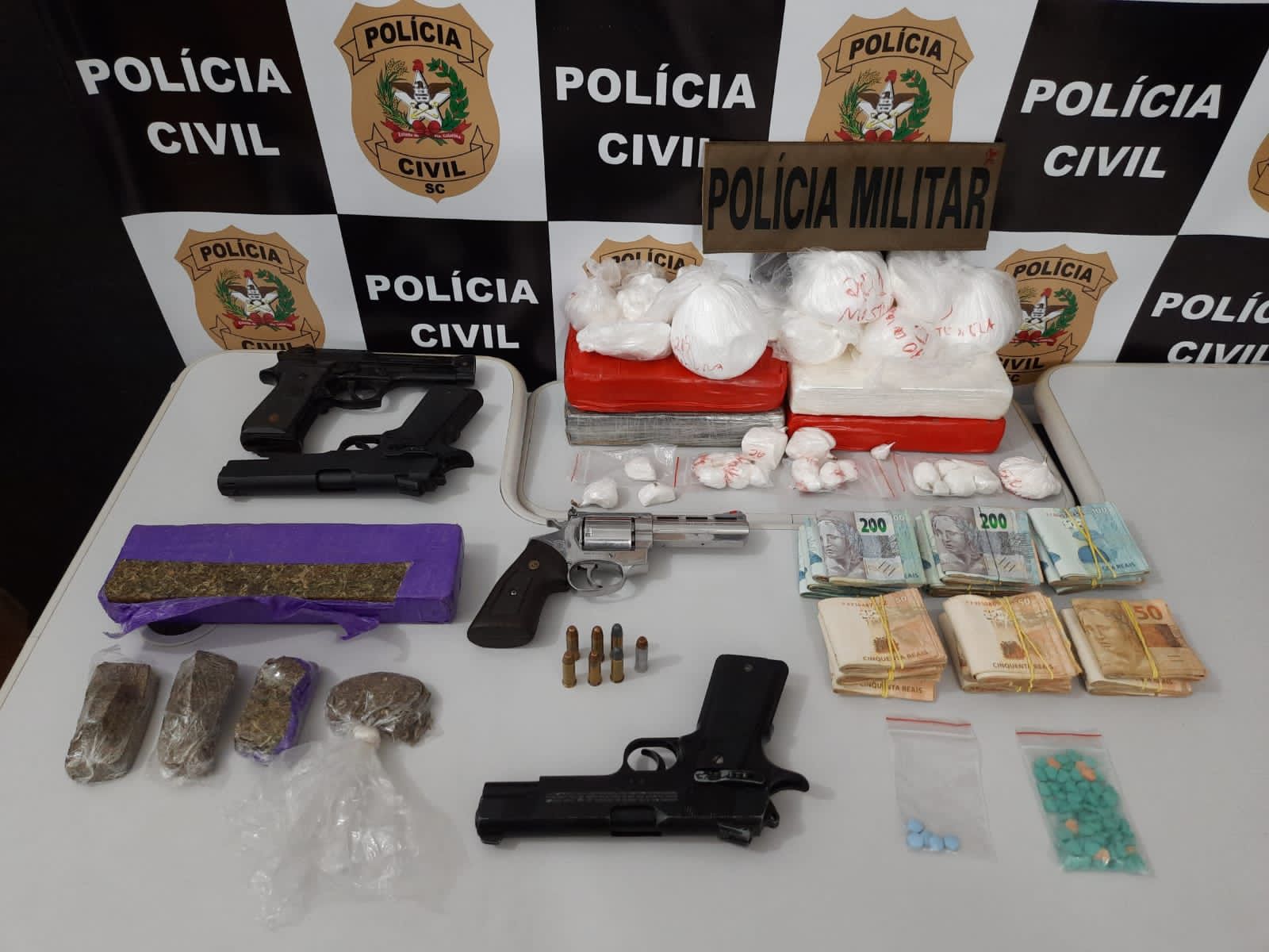 No total foram cumpridos 8 Mandados de Busca e Apreensão, 4 Mandados de Prisão Preventiva e 3 pessoas presas em flagrante delito. Também foram apreendidos cerca de R$ 20.000,00 (vinte mil) reais em espécie, aproximadamente 6 quilos de cocaína, 95 comprimidos de ecstasy, aproximadamente 1 (um) quilo de maconha, 1 (um) revólver .38, 3 (três) simulacros de pistola, balança de precisão e munições.