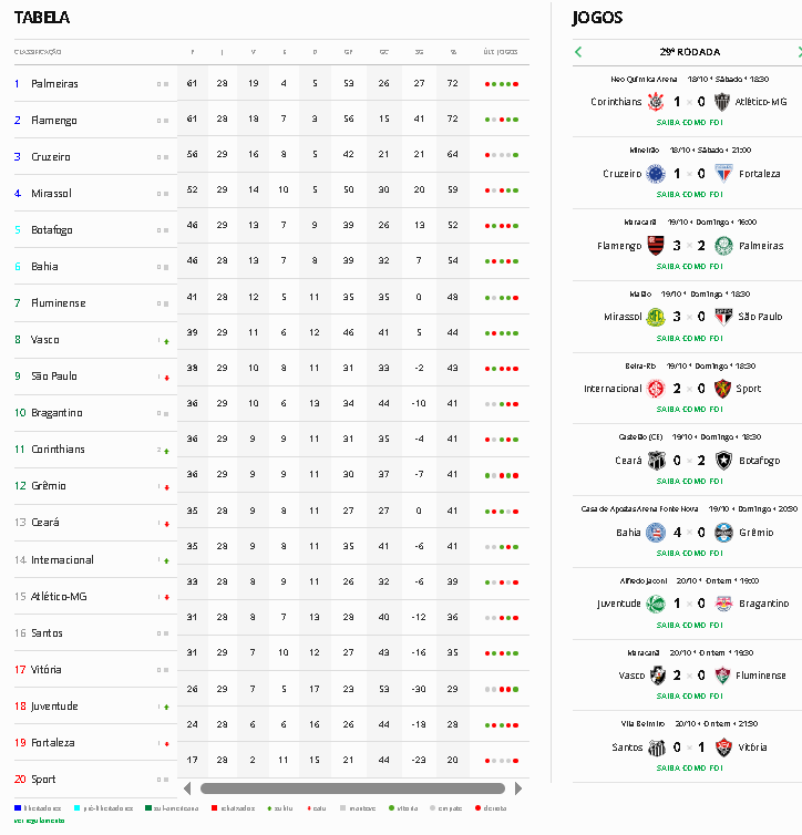 O Gigante da Colina foi a 39 pontos e ultrapassou o São Paulo, assumindo a oitava colocação. O time de Fernando Diniz tem a terceira melhor campanha do segundo turno, com os mesmos 20 pontos do Mirassol, atrás de Palmeiras (22) e Flamengo (21).