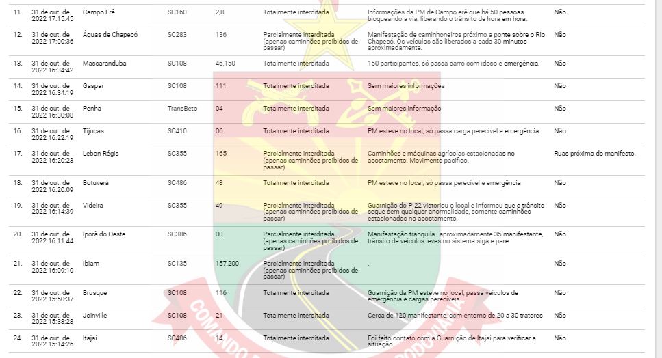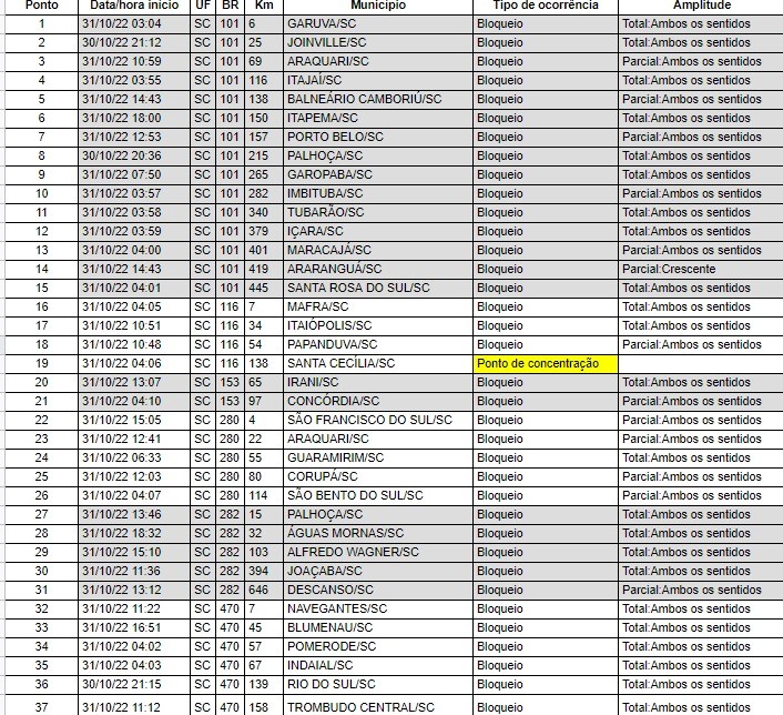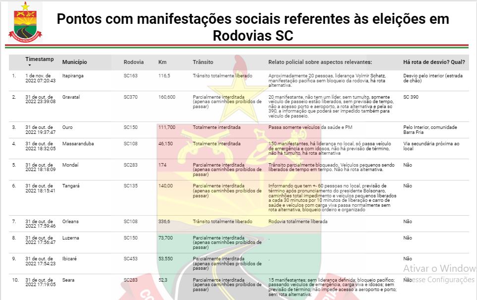 As manifestações de grupos bolsonaristas iniciadas em rodovias na noite de domingo, 31, após a divulgação do resultado das Eleições 2022, continuam por todo o estado. A Polícia Rodoviária Federal (PRF) e a Polícia Militar Rodoviária (PMRv) atualizaram a lista das rodovias bloqueadas.