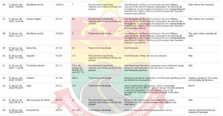 No estado, são 39 rodovias federais totalmente ou parcialmente bloqueadas, e 45 rodovias estaduais. As duas forças de segurança afirmam estar negociando com os manifestantes para que as vias sejam liberadas.